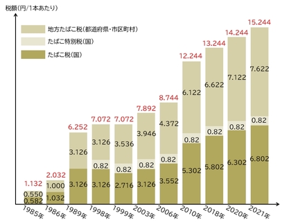 日本たばこ産業(JT)が毎年公表している「Fact Sheets」によると、紙巻たばこ1本あたりのたばこ税は、1985年には1.13円だったのが、2022年10月時点で15.244円と、実に約15倍になっています(【図表1】参照)。