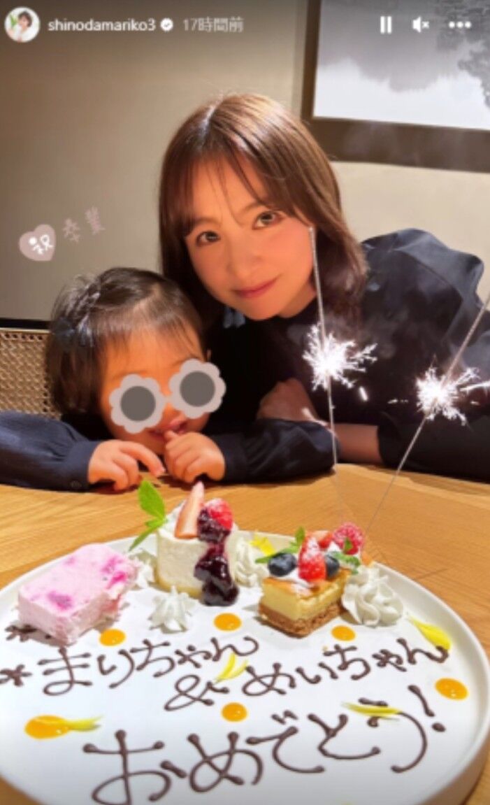 この日のストーリーズでは、制服姿の娘(※顔は加工ずみ)との2ショットや「まりちゃん&めいちゃん おめでとう」との文字がチョコレートで書かれたデザートの写真などをアップ。