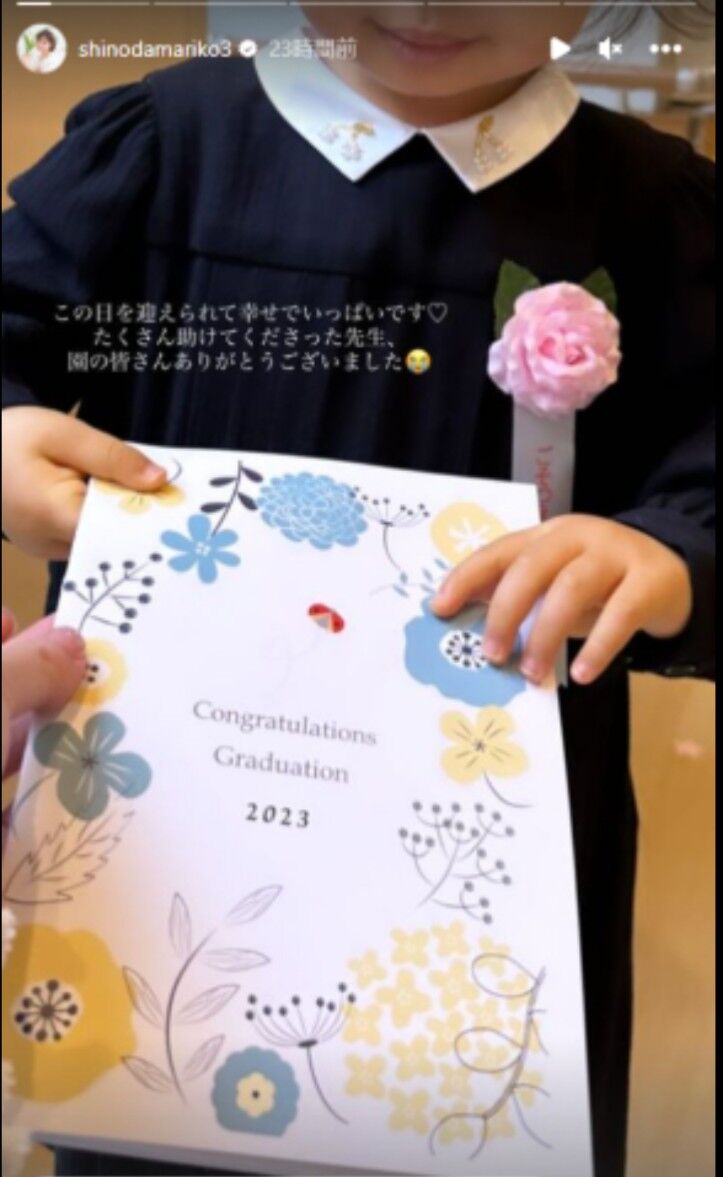 「この日を迎えられて幸せでいっぱいです♡ たくさん助けてくださった先生、園の皆さん ありがとうございました」「祝 卒園」などと書き込んだ。