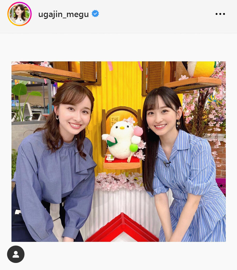 TBSアナウンサーの宇賀神メグアナウンサー(27)が4日までに自身のインスタグラムを更新。「THE TIME,」(月~金曜午前5時20分)で3日の放送から月曜日の新レギュラーとして出演する乃木坂46一ノ瀬美空(19)とのツーショットを公開した。