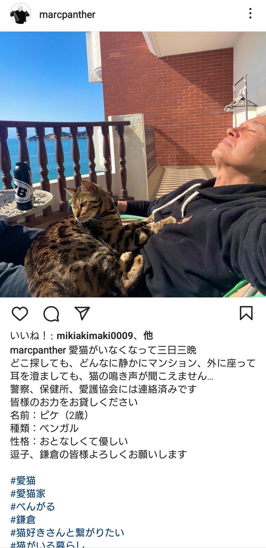 行方不明になったことを伝える投稿には、ベランダでくつろぐマークの膝上で寝転ぶ愛猫の写真が添えられていた。