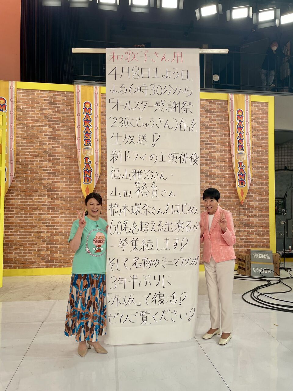TBSは8日、『オールスター感謝祭’23春』(土曜午後6時30分)を生放送する。今回も豪華ゲストが勢ぞろいする中で、MCの島崎和歌子のために作られた“巨大すぎるカンペ”が注目を集めている。