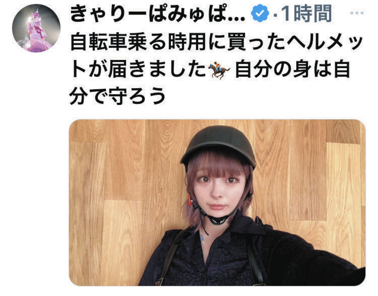 マルチタレントのきゃりーぱみゅぱみゅが17日、ツイッターを更新。4月1日からの改正道路交通法施行により自転車に乗る際のヘルメット着用が努力義務化されたため「自転車の乗る時用に買ったヘルメットが届きました。自分の身は自分で守ろう」と、乗馬用にも見える黒いキャップ型ヘルメットをかぶった写真を投稿した。