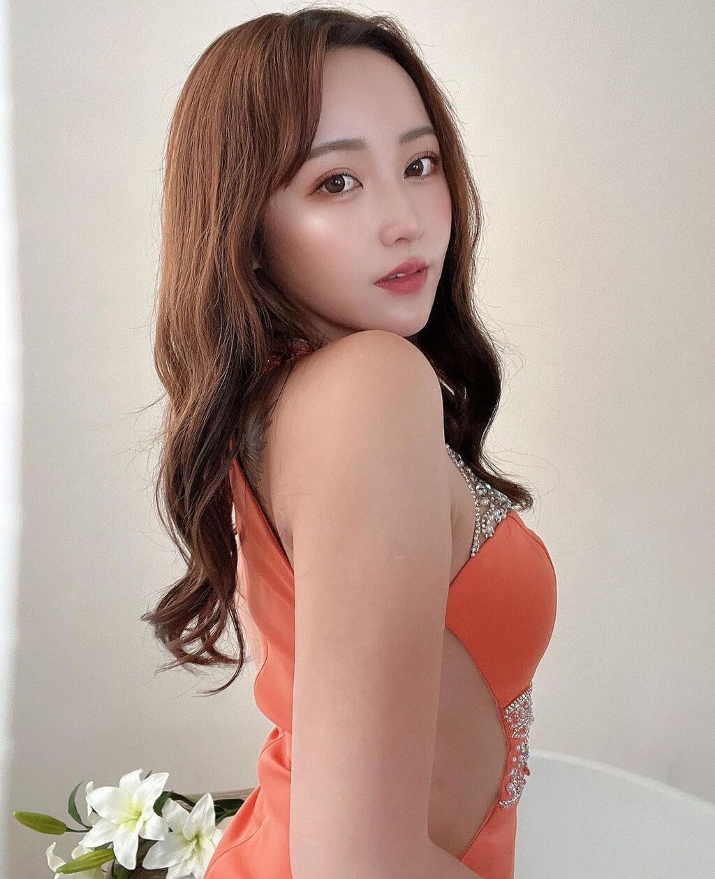 「今日は久々に大きめのカラコンつけた 加工アプリもあってか人形感ある」とつづり、胸元とサイドが開いたオレンジ色のドレス姿の写真をアップした。