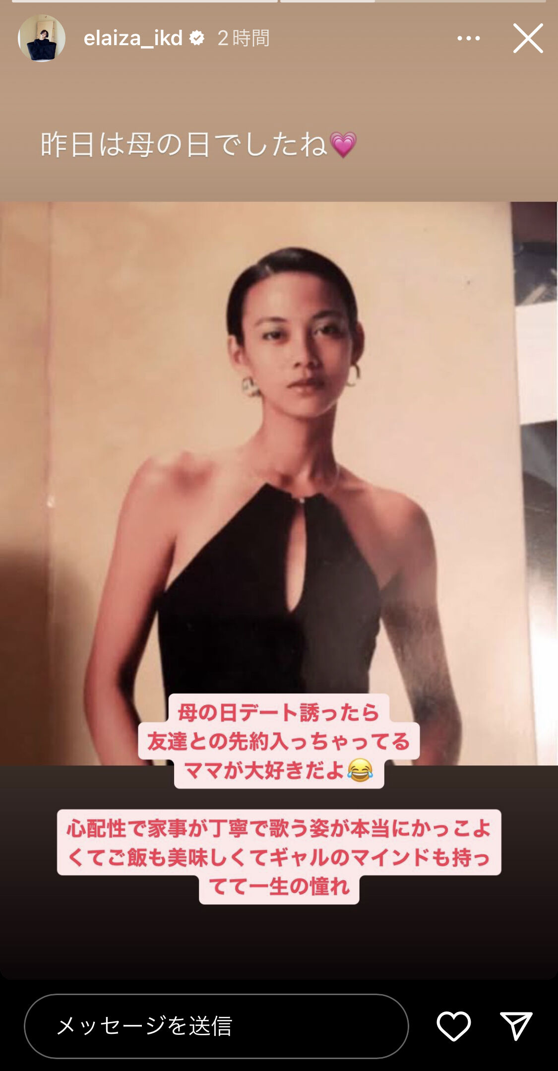 過去に出演したテレビ番組などで、母国でモデルや歌手として活動する母への憧れを語っていた池田。今回の投稿でも「心配性で家事が丁寧で歌う姿が本当にかっこよくてご飯も美味しくてギャルのマインドも持ってて一生の憧れ」とつづった。