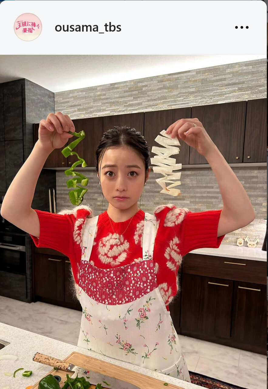 この日の環奈さんは、可愛らしいエプロン姿を公開。ギリギリ切れていない野菜を掲げて困った顔をする彼女は非常にキュートで、ずっと見ていたい一枚となっている。
