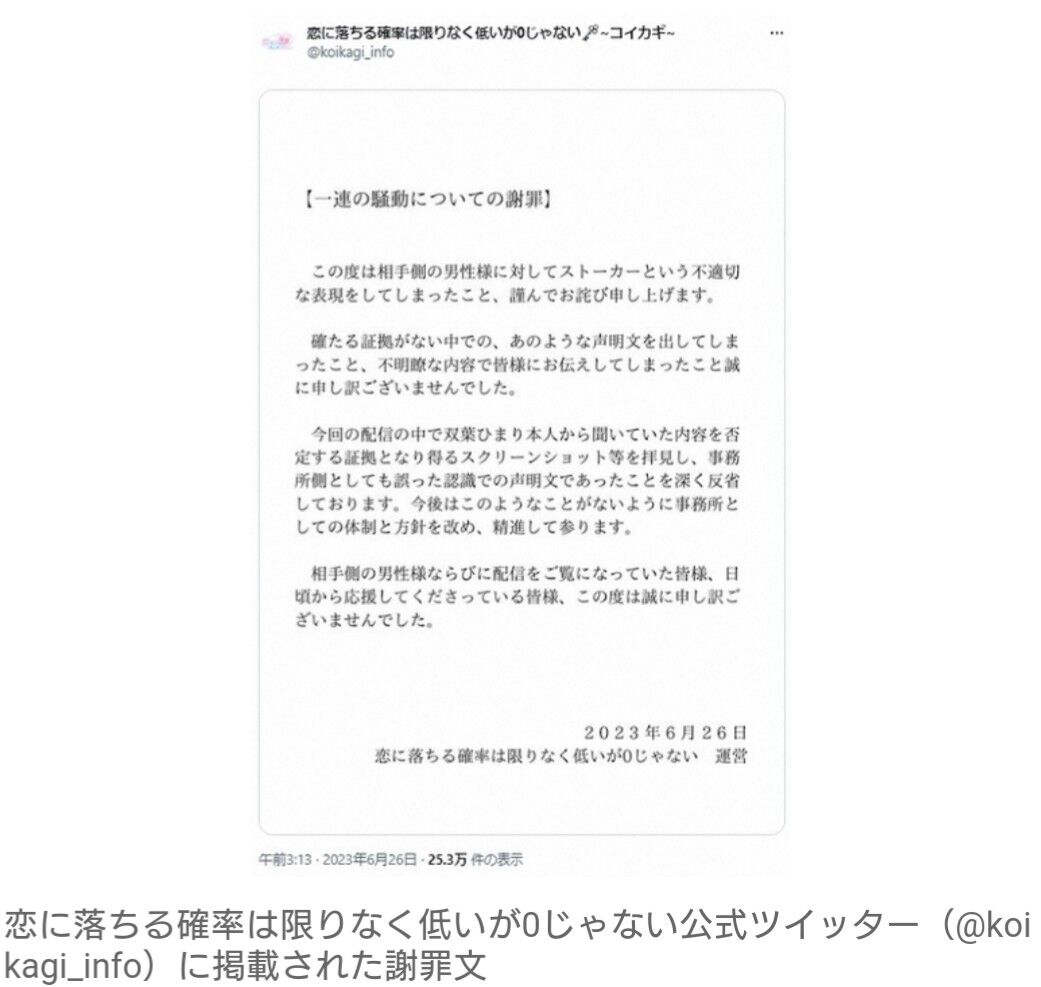 一連の対応について、所属事務所は公式SNSに「一連の騒動についての謝罪」と題するお詫びを掲載。「この度は相手側の男性様に対してストーカーという不適切な表現をしてしまったこと、謹んでお詫び申し上げます。確たる証拠がない中での、あのような声明文を出してしまったこと、不明瞭な内容で皆様にお伝えしてしまったこと誠に申し訳ございませんでした」と謝罪した。