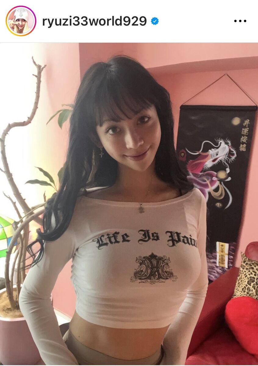 ryuchellは体にフィットしたウエストをのぞかせるショート丈のカットソーを着て、黒く染めたロングヘア姿を披露。「とあるお仕事が始まる事情で黒髪に戻しました」と記した。