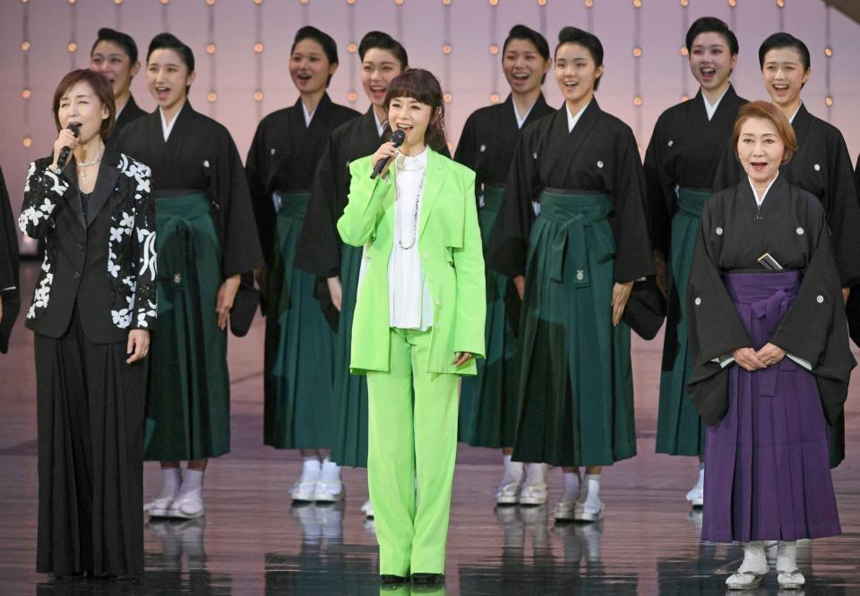 本科生・予科生らとともに校歌斉唱する大地真央(中央)と杜けあき(左端)=撮影・石井剣太郎