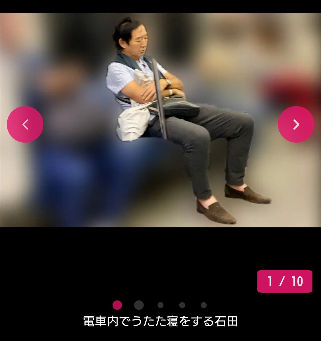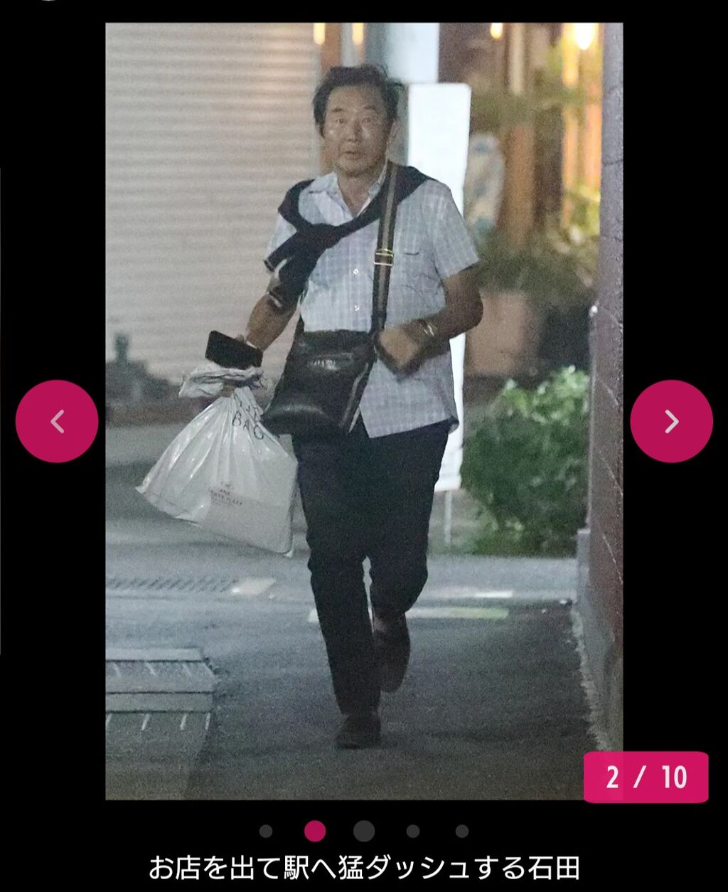 23時過ぎ、お店を出た石田は駅へ猛ダッシュ!この時間の駅周辺は人もまばらだが、さすがに石田に気が付く人は多く、みんな振り返っている。ギリギリで電車に乗りこんだ石田は安堵した様子を浮かべていた。