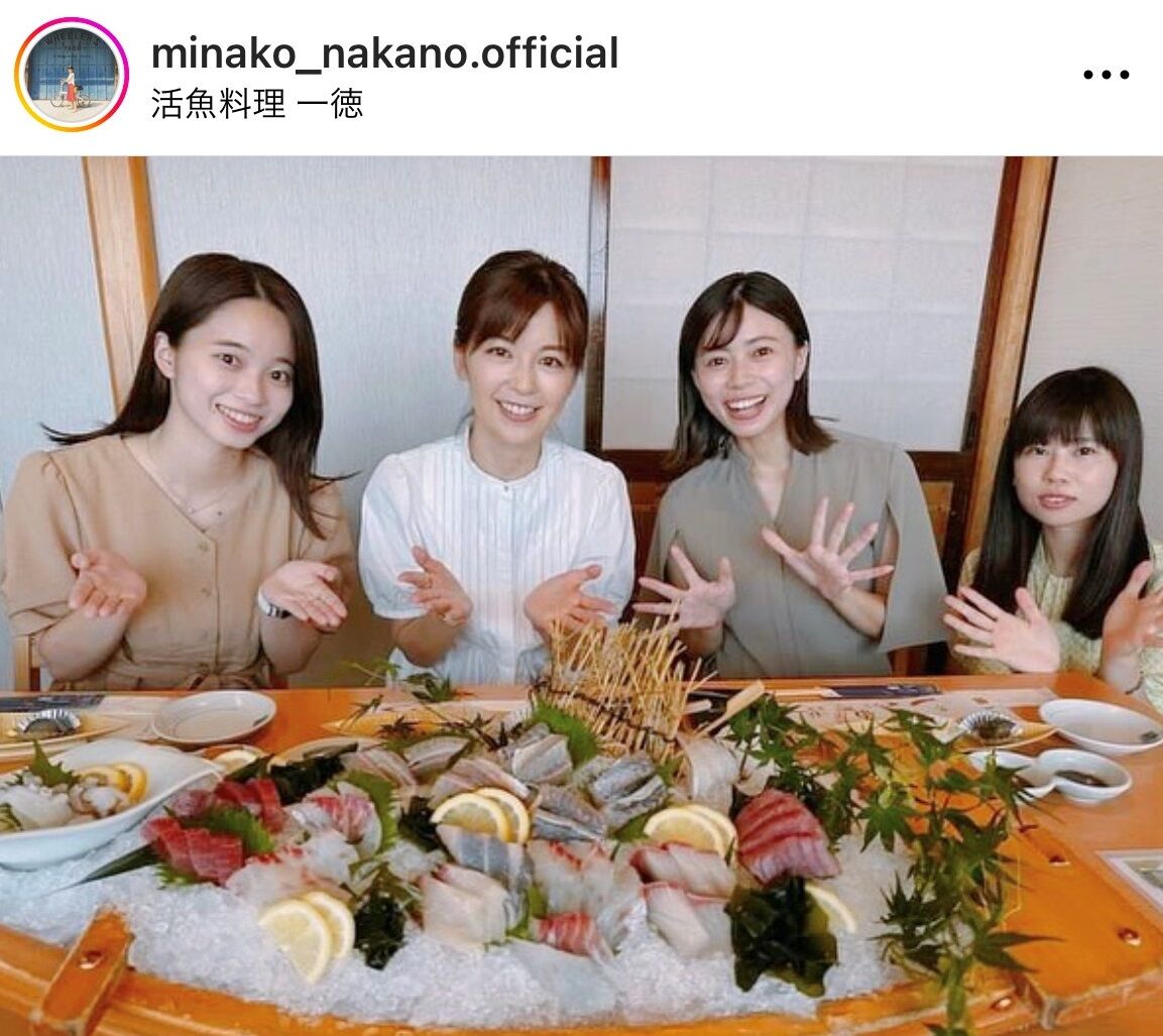 香川県丸亀市に移住した、元フジテレビアナウンサーで現在はフリーの中野美奈子アナが26日、自身のSNSを更新。地元放送局の後輩アナウンサーたちとの豪華なお刺身会食ショットを披露した。