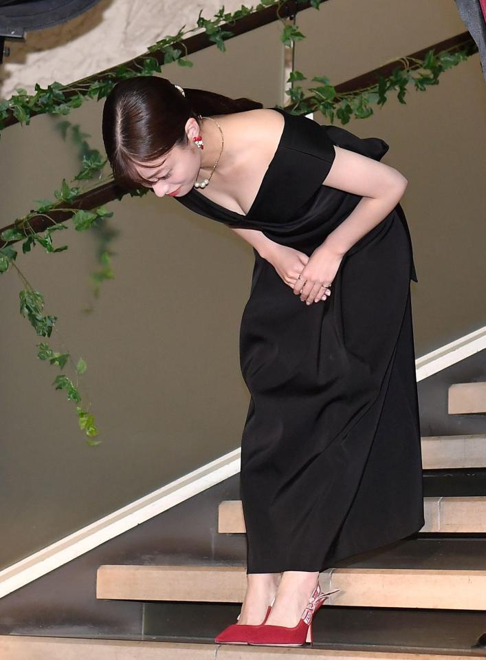 橋本は胸元ザックリの黒いオフショルダードレスで登場し、視線を釘付け。発光するような白い肌に大人の色香を漂わせ、おじぎすると、無数のフラッシュを浴びた。