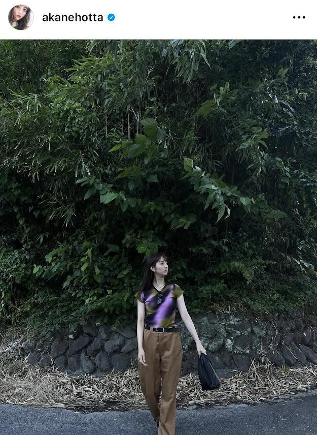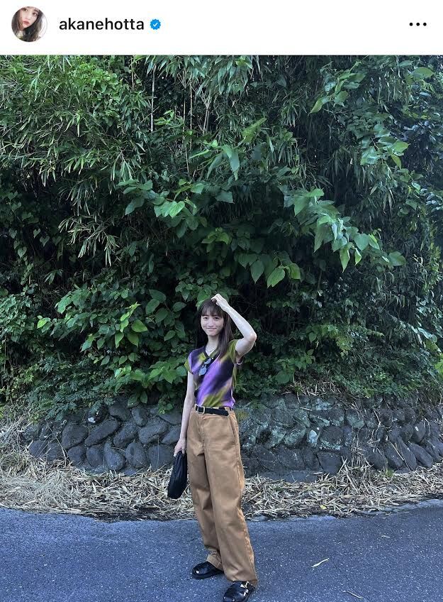 堀田は「夏休み 箱根に行ってきました 皆さんは夏の間どこかに行く予定はありますか?」「#あかねのしふく_」とつづり、緑や紫などの色が混ざり合ったデザインのトップスにブラウンのワイドパンツ、黒のサンダルとバッグを合わせたコーデをアップ。