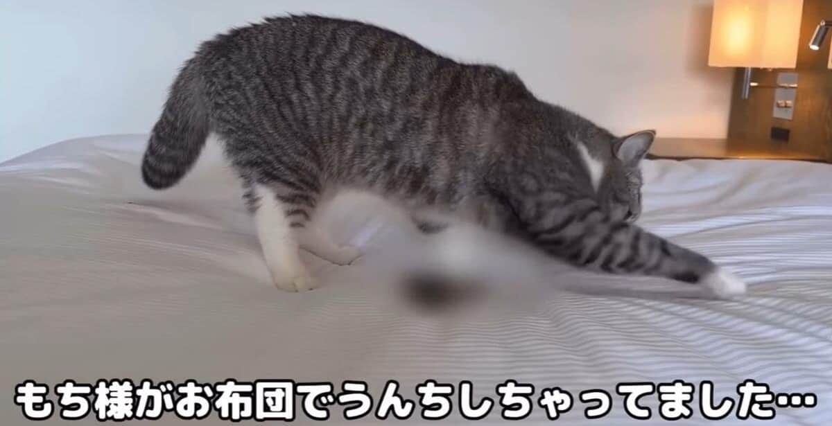 猫には便に砂をかけて処理する習性があるため、もちまるはシーツを何度も引っかく。その間、飼い主はカメラを回し、「猫砂がないので隠せません…目が覚めてうんちしたかったけど 家じゃなくホテルだったのでトイレまで間に合わなかったのでしょうか…昨日はちゃんとトイレでできてたのですが 珍しく失敗しちゃったみたいです」とコメントを挿入している。