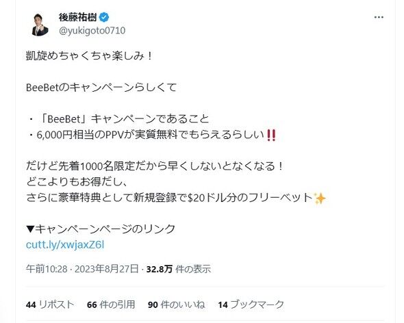 投稿文は「凱旋めちゃくちゃ楽しみ!BeeBetのキャンペーンらしくて ・『BeeBet』キャンペーンであること ・6,000円相当のPPVが実質無料でもらえるらしい!! だけど先着1000名限定だから早くしないとなくなる! どこよりもお得だし、さらに豪華特典として新規登録で$20ドル分のフリーべット」と、オンラインカジノなどを運営するサイト「BeeBet」のキャンペーンを告知するような内容で、サイトのキャンペーンページへのリンクも貼られていました。