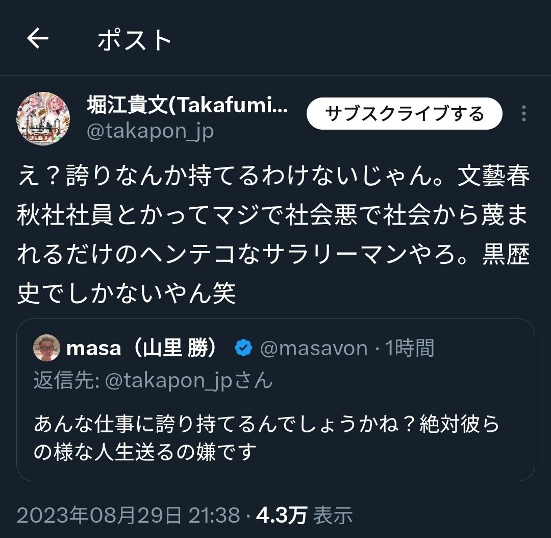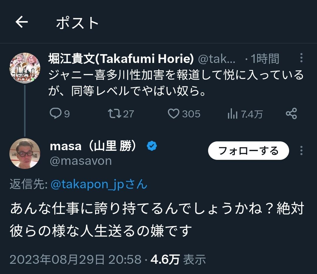 (出典 ホリエモン「ジャニー喜多川の性加害を報道して悦に入ってるマスコミはクソ。特に文春」)