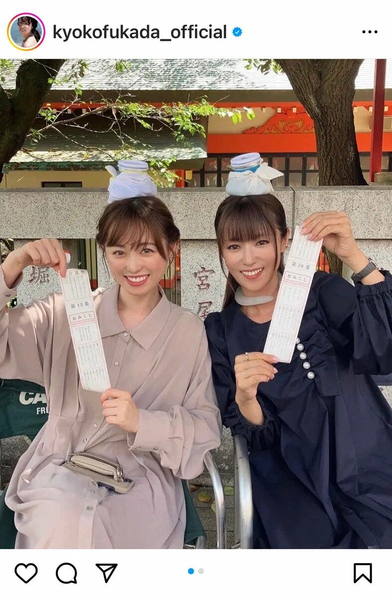 深田が「残暑が続いていますね 暑い日々ですが、皆様暑さ対策をして体調にどうかお気を付けくださいね」とつづり投稿したのは、福原とのオフショット。1枚目は氷のうを頭に乗せたふたりがカメラに笑顔を向ける写真で「まだまだドラマ『18/40~ふたりなら夢も恋も~』の撮影中ですが、現場では氷嚢で暑さを凌いでいます 撮影の合間におみくじを引いた時の写真です」と記した。