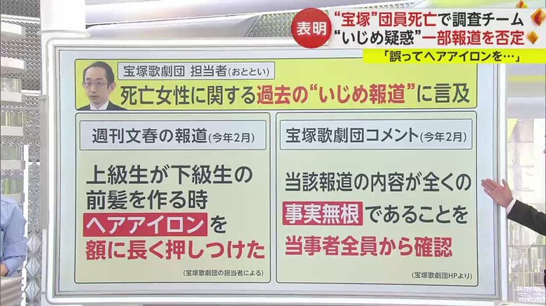宝塚歌劇団の劇団員が死亡した件で、劇団は7日に会見を開いた。そこで外部の弁護士をメンバーとする調査チームを発足させる考えを示した。一方で、“ヘアアイロンを額にあてた”という一部週刊誌のいじめ疑惑報道については“偶然あたってしまったもの”と否定した。