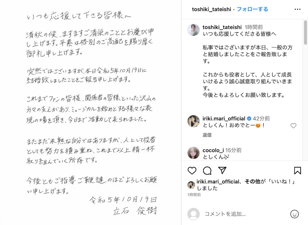 立石さんはInstagramで「私事ではございますが本日、一般の方と結婚しましたことをご報告致します」と結婚を伝え、手書きの文書の画像も投稿。「これまでファンの皆様、関係者の皆様といった沢山の方々の支えがあり、ミュージカルを始めとする様々な表現の場を頂き、今日まで活動して来られました」と、ファンと関係者への感謝をつづっています。