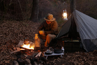 快適だと感じることのひとつに、虫がほぼいないことが挙がるのではないでしょうか。煩わしい、苦手、と思っている人にとってはとても嬉しい環境です。そして、通年でキャンプを楽しむ人が冬キャンプの魅力として挙げることが多いのが、「夏場に比べて混雑がなく、ゆったりと楽しめる」「料金設定がリーズナブル」ということ。他にも、夏場と見える景色がまるで違うことや、空気が澄んでいるが故に、綺麗にはっきりと見える『星空』も外せないのでは? 日の出や日の入りもクリアに見ることができますし、湿度の多い夏の空とは違った色の変化を楽しむこともできます。さらに『冬のアクティビティ』との合わせ技も魅力。ワカサギ釣りは冬の代名詞かもしれませんが、スノーシューを履いてのトレッキングとともに楽しむのも一興です。そして、絶対に外せないことのひとつであり、この時季だからこそ大きな恩恵を感じるのが『火』の存在。焚き火や炭コンロは、暖かさだけでなく、明るさにもホッとさせられるもの。じっくり調理も大歓迎な気分になる季節です。
