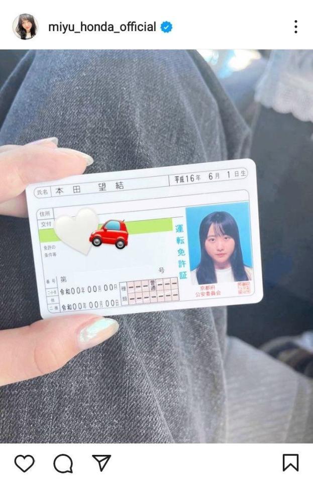 「本田望結 平成16年6月1日生」と書かれた免許証を手にした写真を添え、「車の免許取れました~!!」と報告。「私の車に乗る勇気のある方、LINEしてください。笑」とおちゃめにつづった。