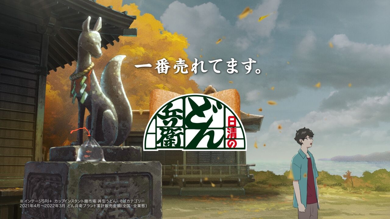 今回のCMはアニメーションとなっており、これまでに登場した二人も登場。「どん兵衛」を食べるメガネの青年 役を戸谷菊之介、「どん兵衛」の化身「どんぎつね」役を小川あんが演じている。キャラクターデザインは「カップヌードル」のTVCM「HUNGRY DAYS」シリーズのキャラクター原案を手掛けた漫画家の窪之内英策だ。